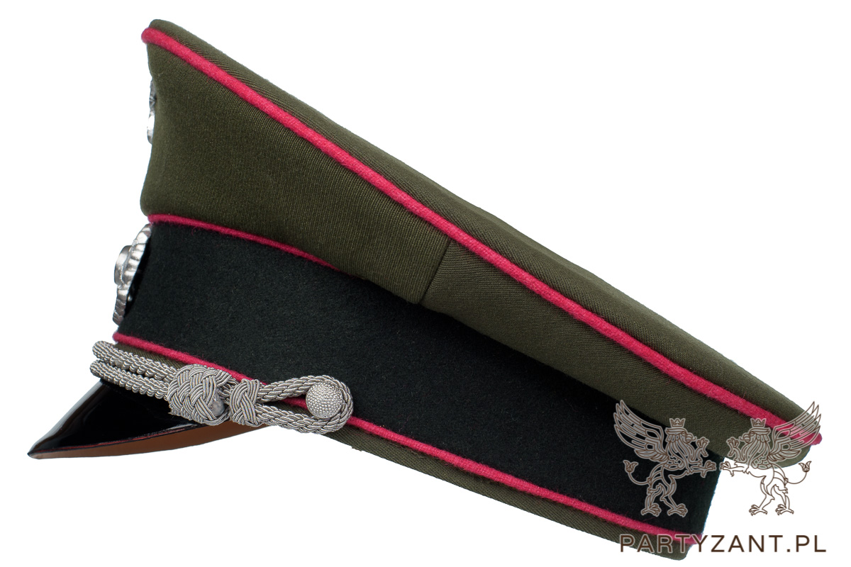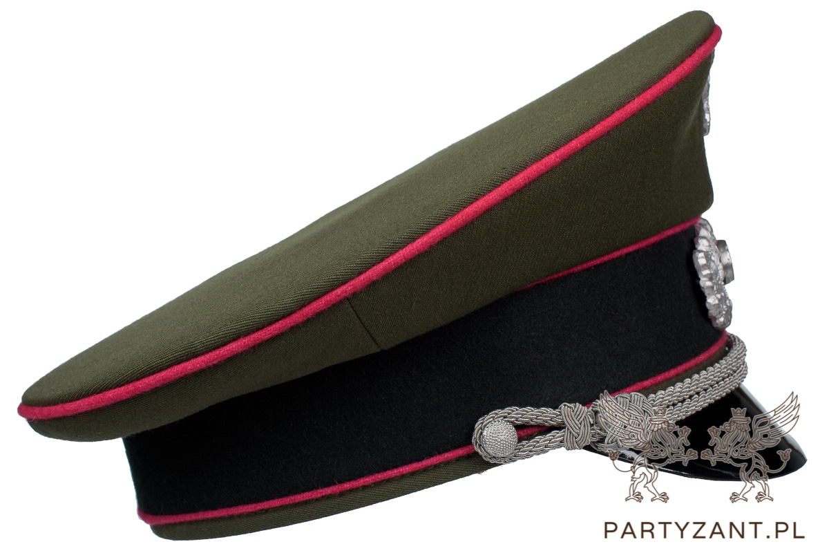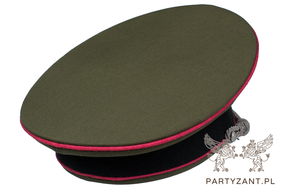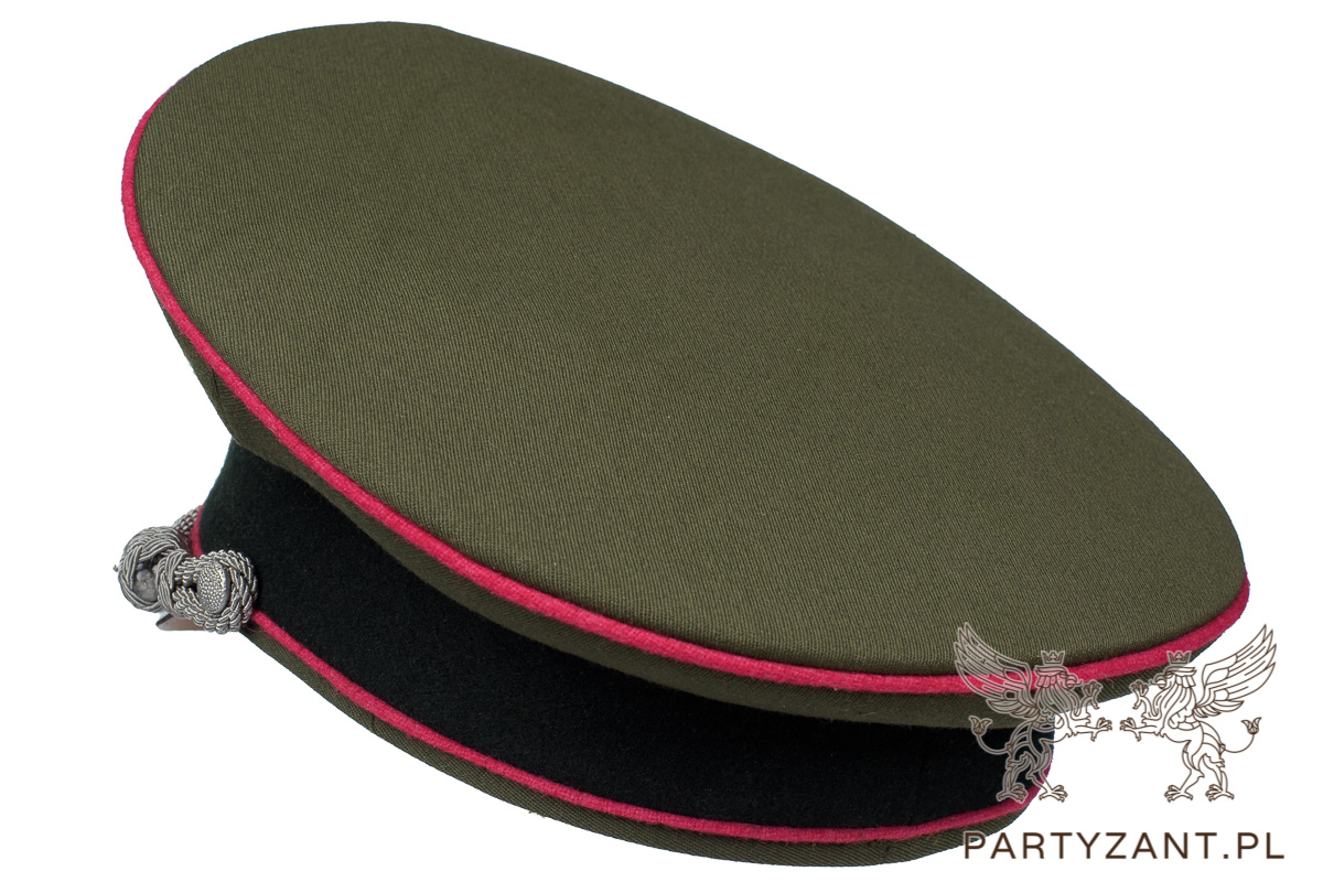- Dark green cap band with rose colored piping (distinctive armor branch color - “waffenfarbe”) at the top and bottom of the cap band