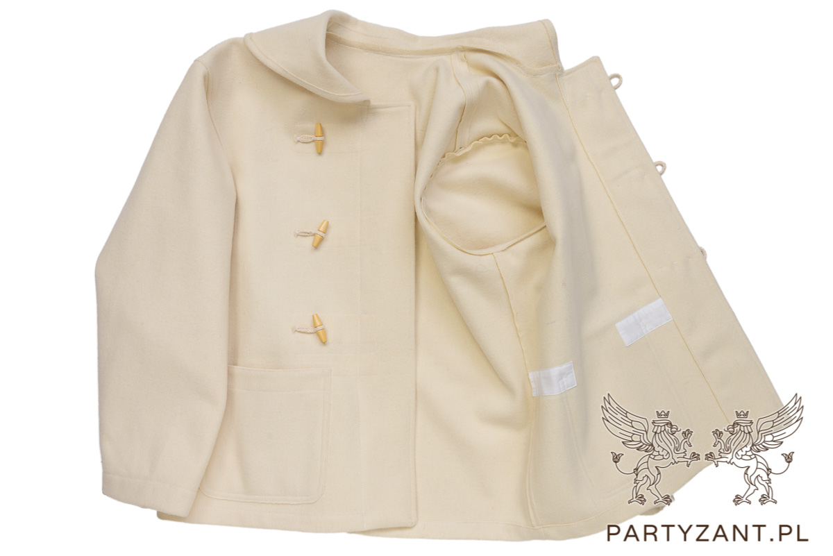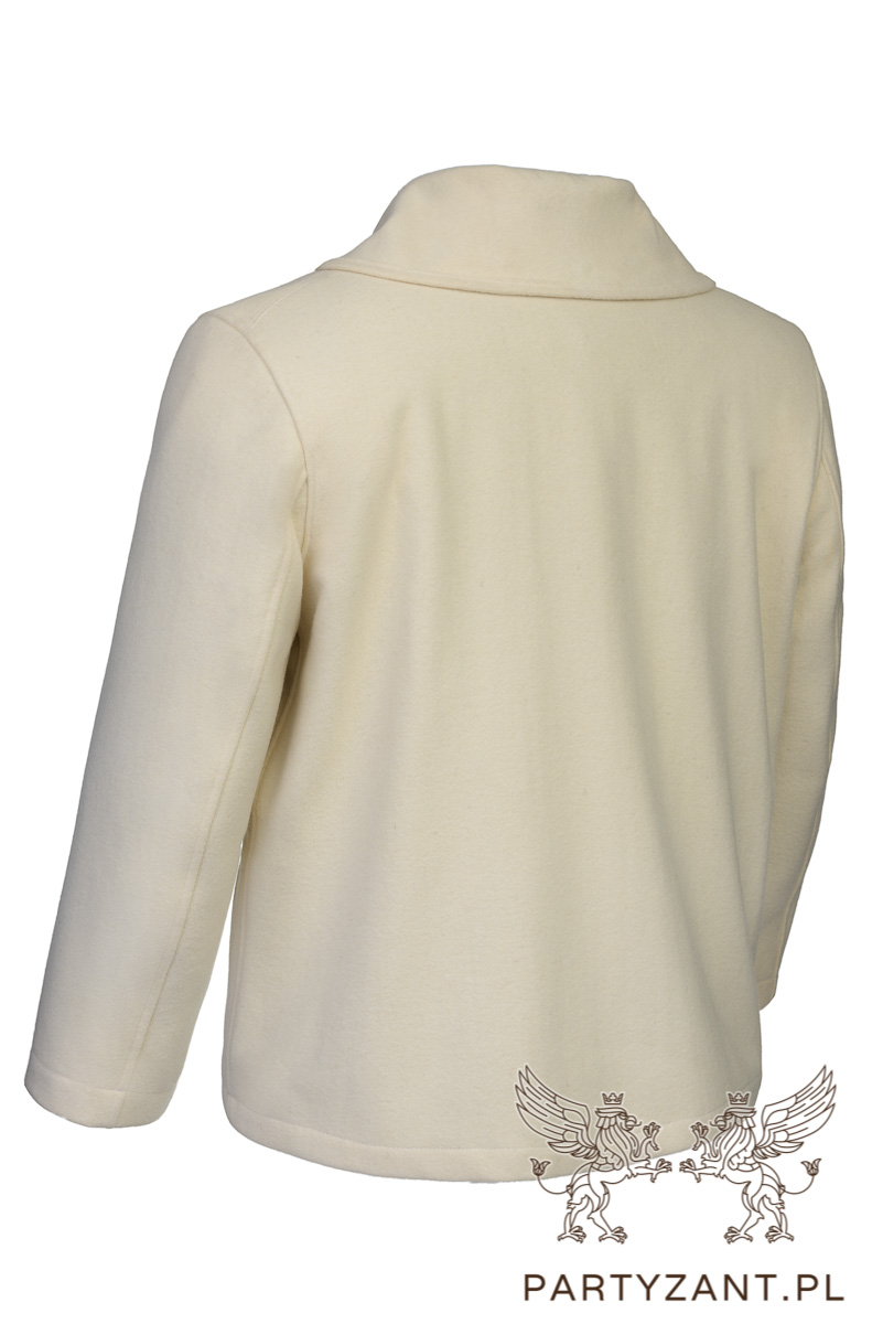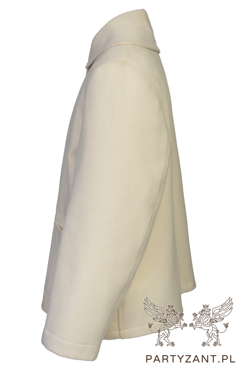 - wykonany z grubego sukna o gramaturze 940 g/m2 w kolorze przełamanej bieli