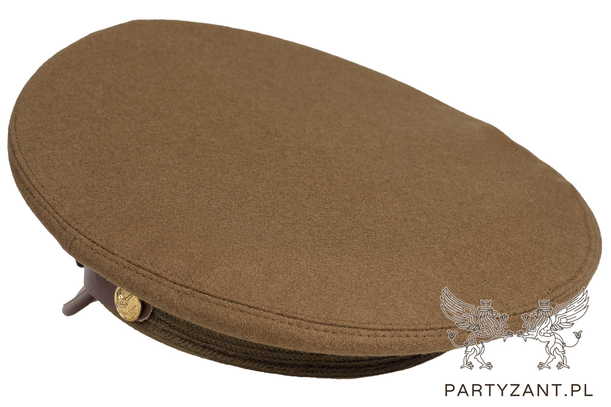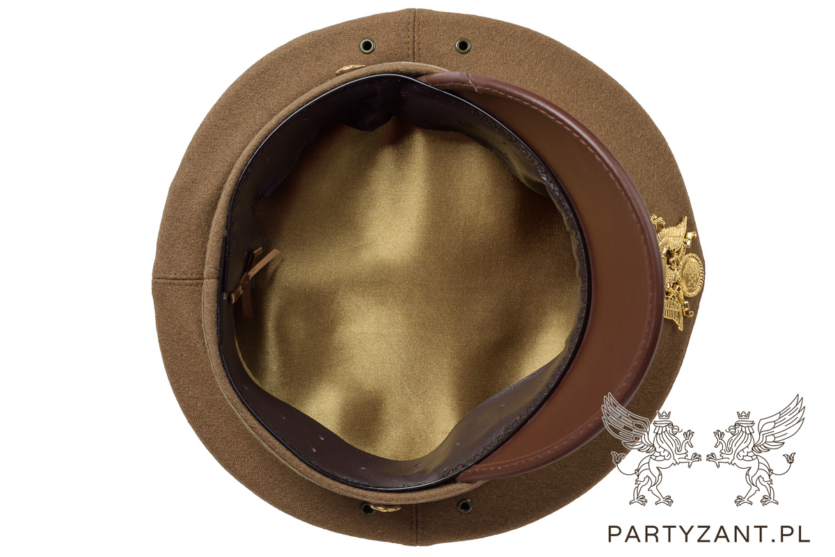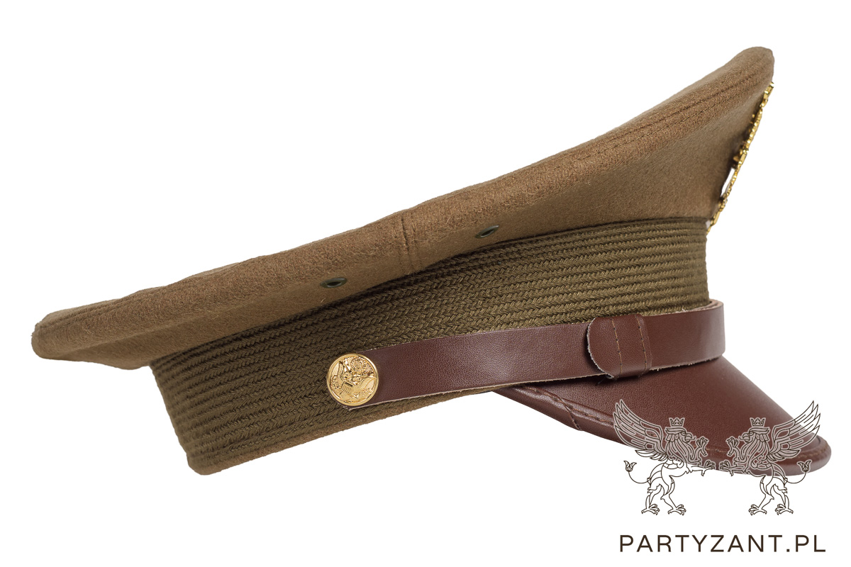 Replika czapki oficerskiej wykonanej z sukna, skóry oraz taśmy rzymskiej, okucia i guziki złocone.