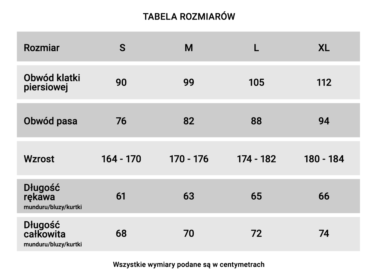 Mundur szyjemy również na miarę (+30% do ceny). Termin realizacji wynosi 2-3 tygodnie lub ustalany jest indywidualnie. Tabela wymiarów dostępna do pobrania. tutaj.