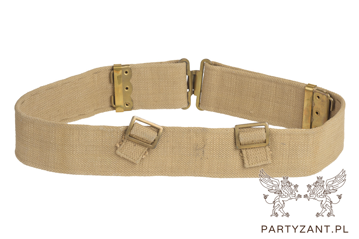 Brytyjski pas główny P37, wykonany z naturalnej party, z okuciami mosiężnymi.