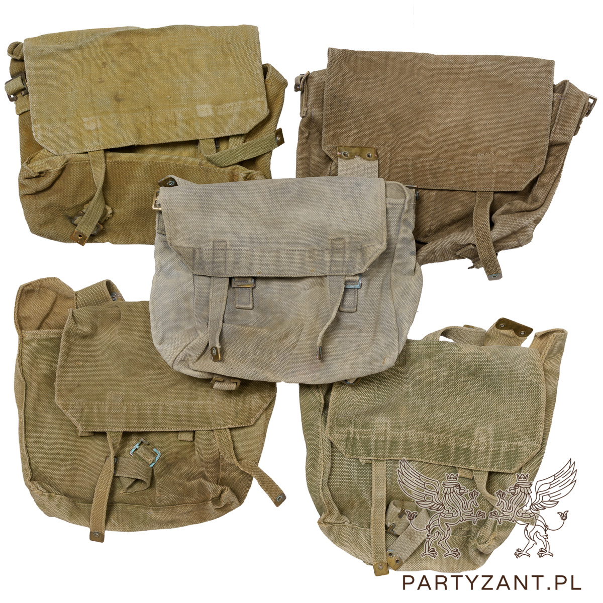 Stan Zachowania: Stan plecaków jest różny. Zdjęcie poglądowe prezentujące pięć plecaków ilustruje różnice w odcieniu, stopniu zużycia materiału, intensywności zabrudzeń (plam) oraz śladach użytkowania (otarcia, lekkie uszkodzenia płótna, korozja okuć).