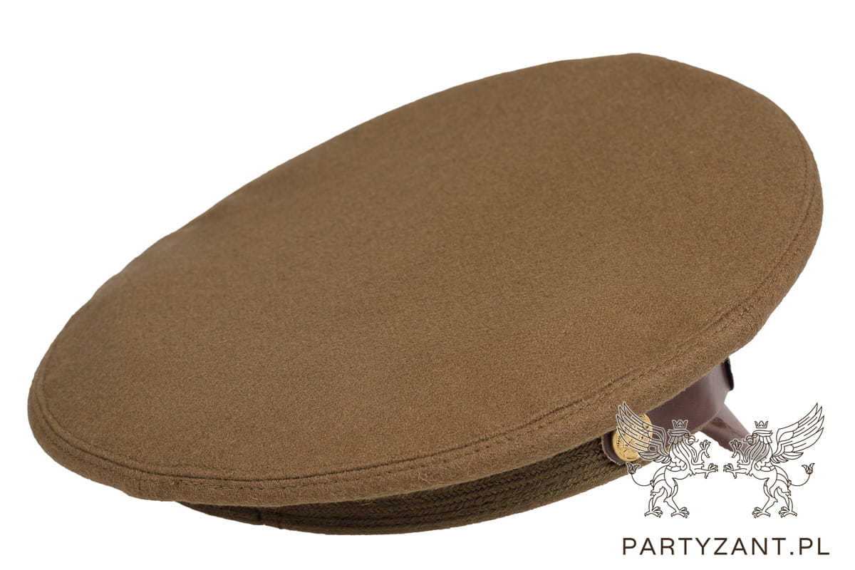 Replika czapki oficerskiej wykonanej z sukna, skóry oraz taśmy rzymskiej, okucia i guziki złocone.
