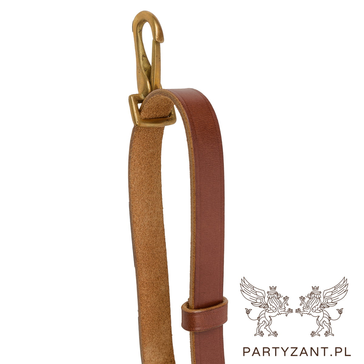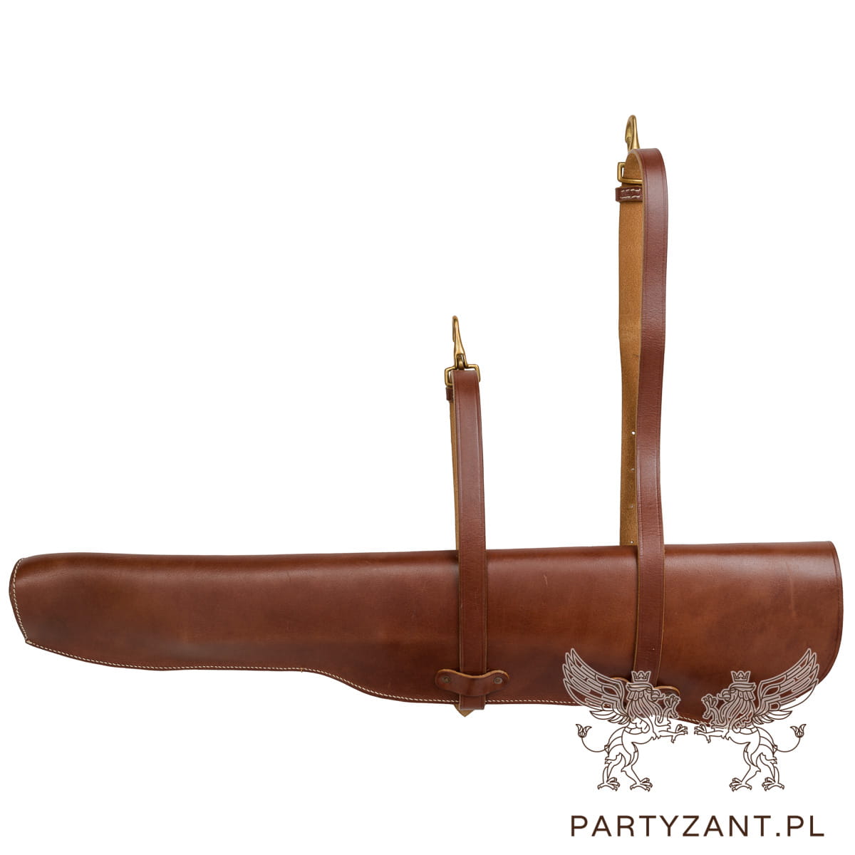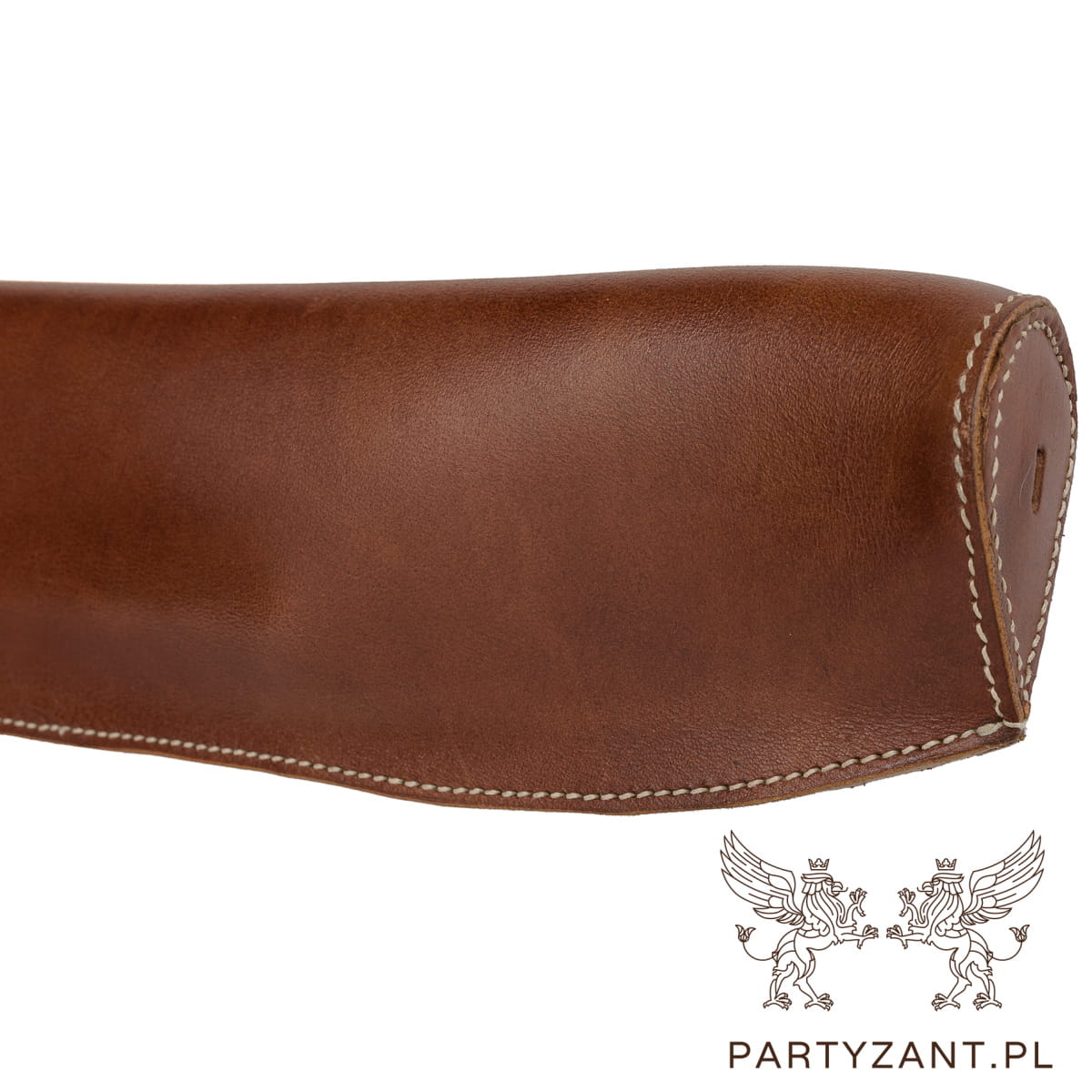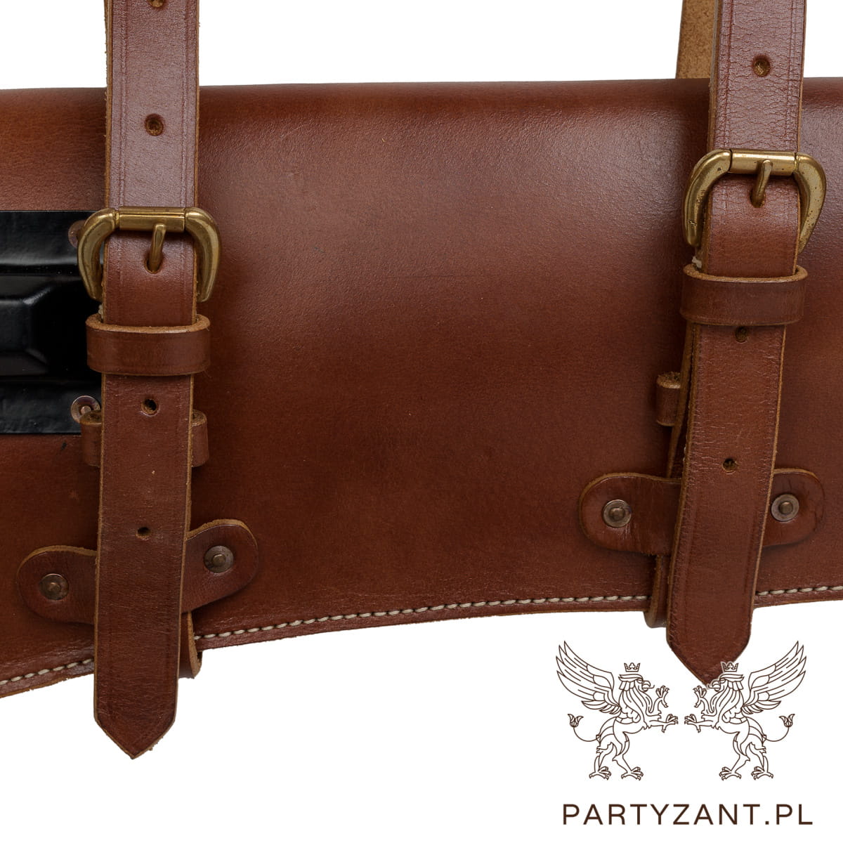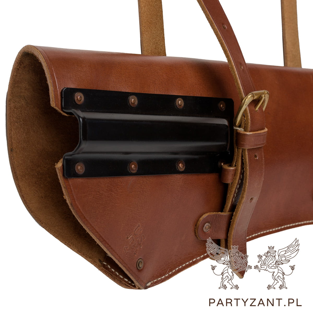 Wykonana z grubej naturalnej skóry, regulowane paski do mocowania w pojeździe,  klamry mosiężne.