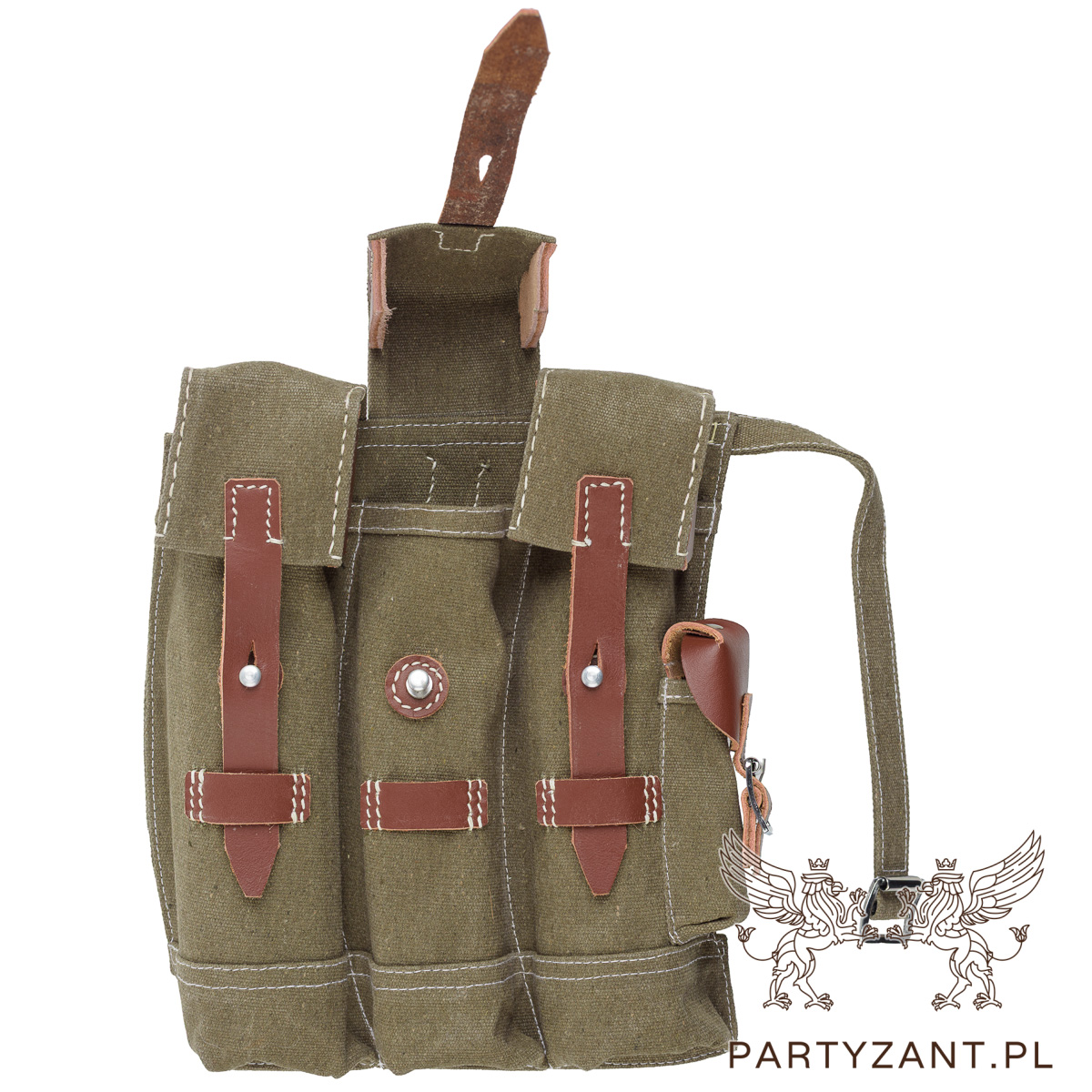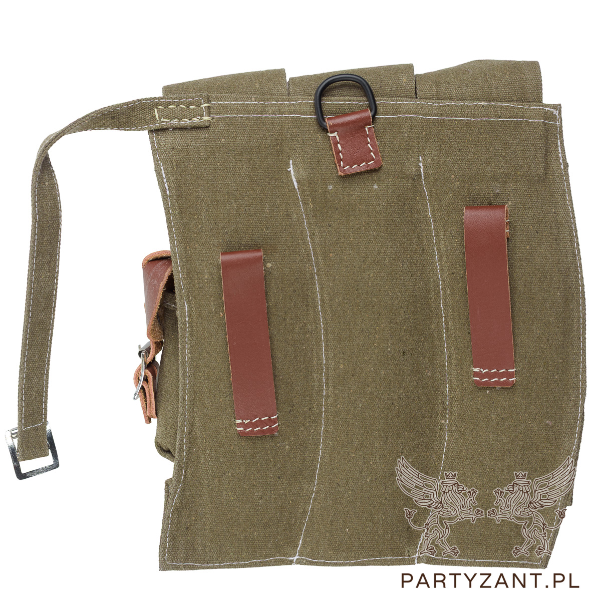 Materiał: Wykonane z grubego, wytrzymałego płótna bawełnianego (parcianego) w kolorze oliwko/brązowym oraz naturalnej skóry w kolorze brązowym.