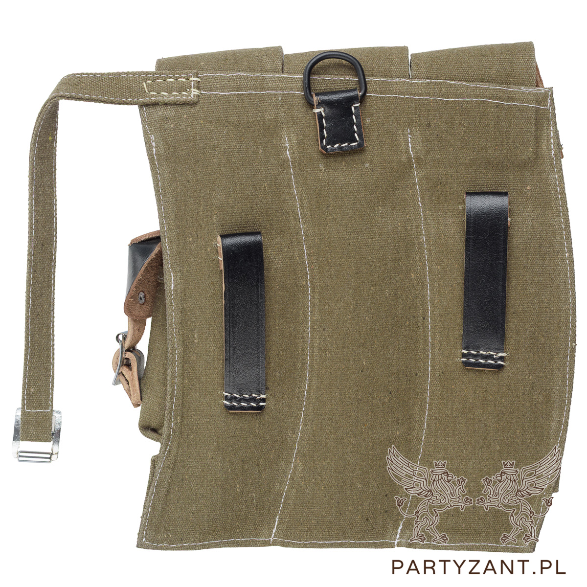 Materiał: Wykonane z grubego, wytrzymałego płótna bawełnianego (parcianego) w kolorze oliwko/brązowym oraz naturalnej skóry w kolorze czarnym.