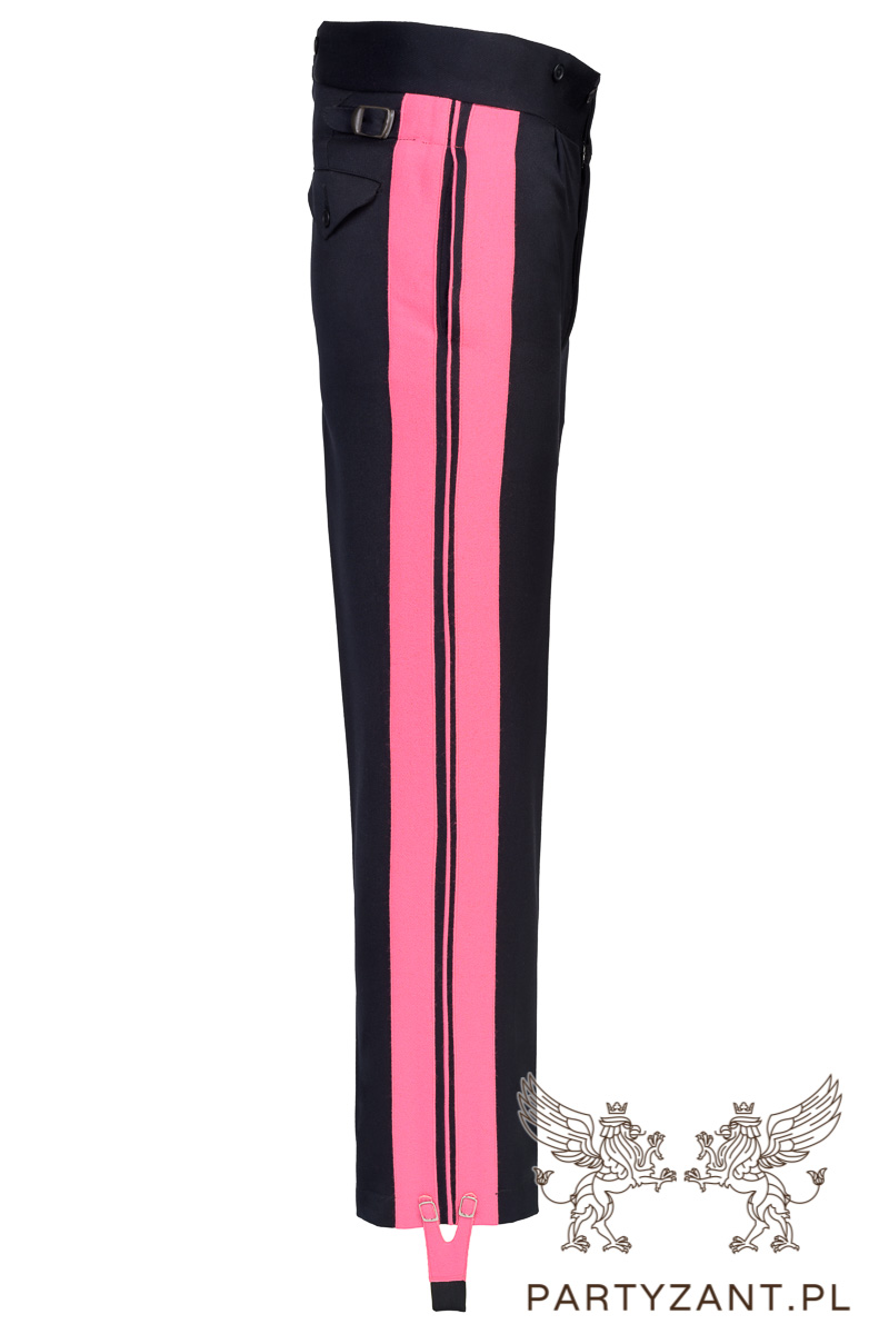 - Dół nogawki zakończony elastyczną taśmą ze strzemiączkami do przeprowadzenia pod butem (sztybletami) w celu obciągania spodni.