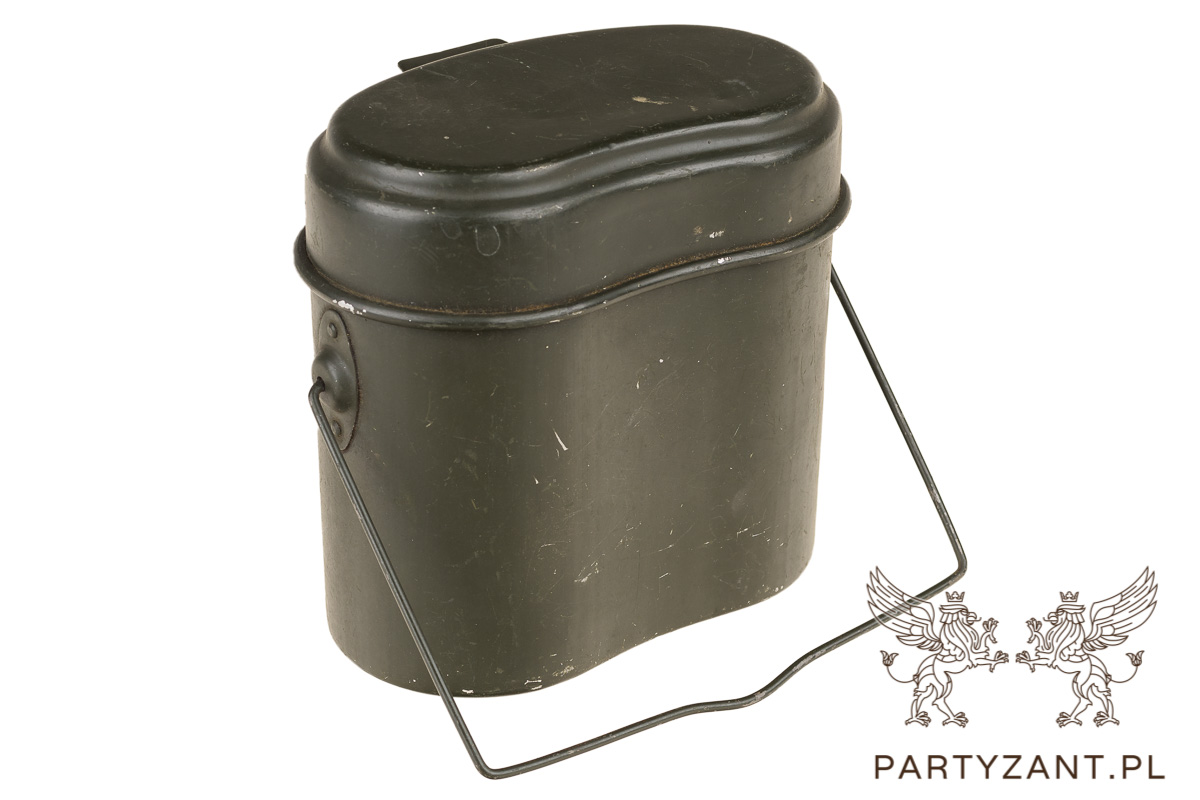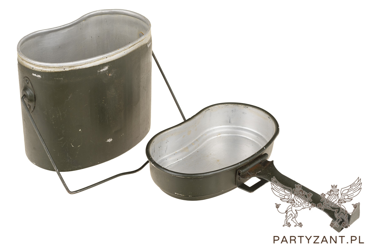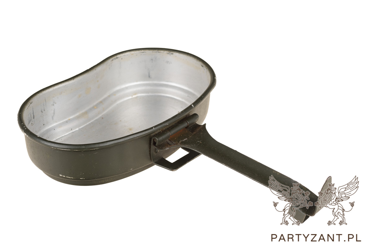 Menażka aluminiowa ze stanów magazynowych (demobil). Nieużywana, malowana, z widocznymi obtłuczeniami farby od przechowania w magazynach wojskowych.