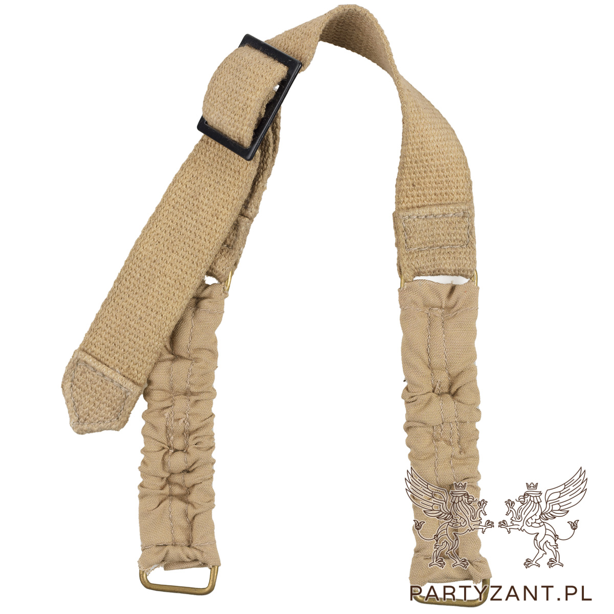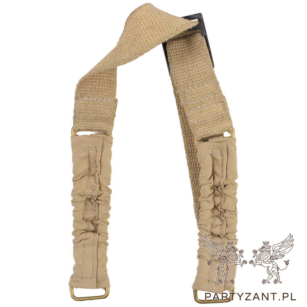 Zaczepy do hełmu oraz klamra regulacyjna są wykonane z mosiądzu, co gwarantuje wytrzymałość i autentyczny wygląd. Klamra została dodatkowo pomalowana na czarno, aby odpowiadać oryginalnemu wykończeniu.