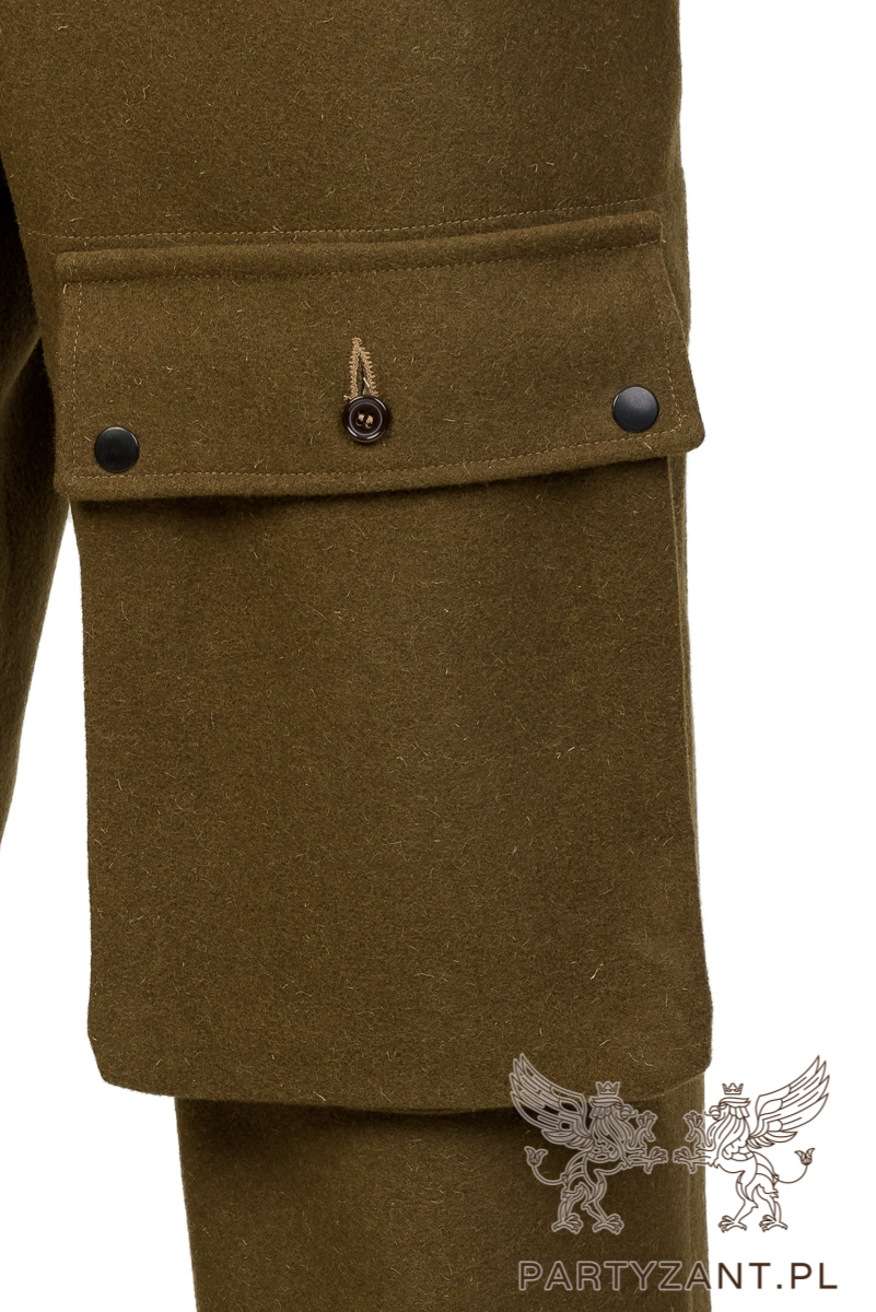 - duża kieszeń na lewej nogawce zapinana na dwa zatrzaski oraz guzik