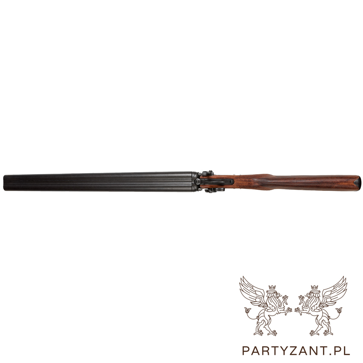Replika strzelby wykonana z metalu i drewna, wyposażona w symulowany mechanizm ładowania oraz oddawania strzału.
